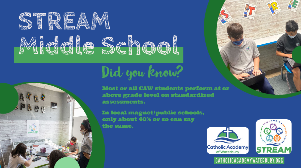 Catholic Academy of Waterbury is beginning its fourth year as a STREAM school, including our departmentalized Middle School students in Grades 6-8. STEM is an exciting and important addition to our traditionally successful programming. Typically, local magnet/public schools will take on a theme including Science, Technology, Engineering, and Math. However, not only does Catholic Academy of Waterbury include these, but as a STREAM school, religion and the arts are also meaningfully integrated in our nationally acclaimed curriculum standards. Most or all Middle School students at Catholic Academy of Waterbury perform at or above grade-level on standardized assessments as compared to about 40% of students at local magnet/public schools. Spotlighting some of the extraordinary achievement this year, we even had some sixth graders score well into the high school level in the area of writing! While we know there are a variety of circumstances that contribute to successful students, we can wholeheartedly attest to our deep commitment to your child's personal and academic pursuits, providing them an innovative education in a loving and faith-filled environment.